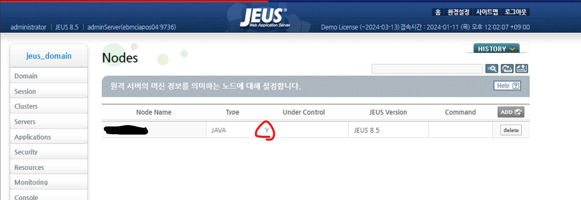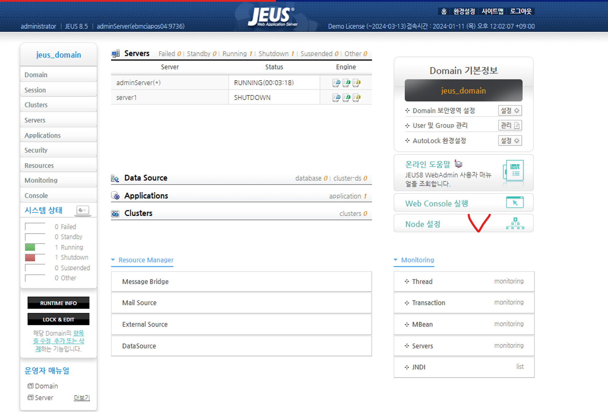 확인 http://{서버ip}/webadmin/login 에 접속 후 Node 설정 클릭