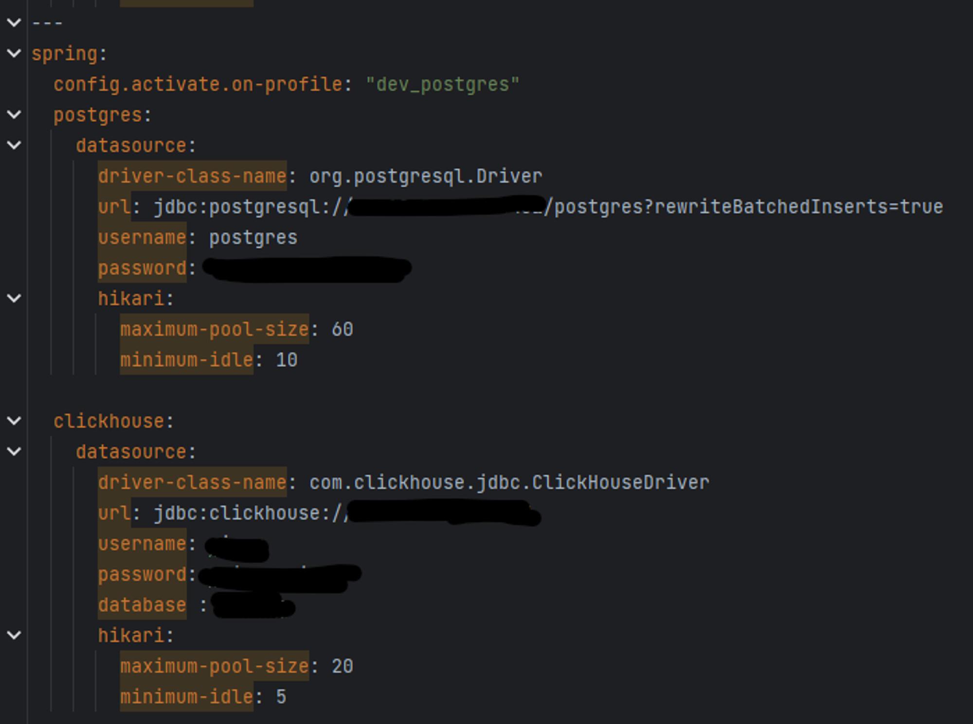 application.yml 파일에 ClickHouse 접속 정보를 추가해준다.