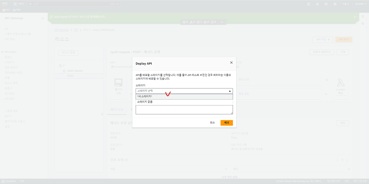 깃허브에서 pull request 를 만들면 api gateway로 요청을 보낸다 api gateway 는 lambda의 함수를 호출하고 lambda 의 함수 로직에서 mattermost를에 메세지를 전송한다